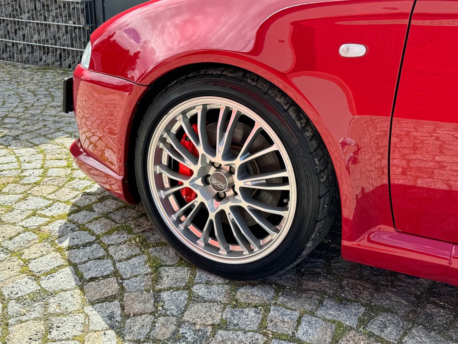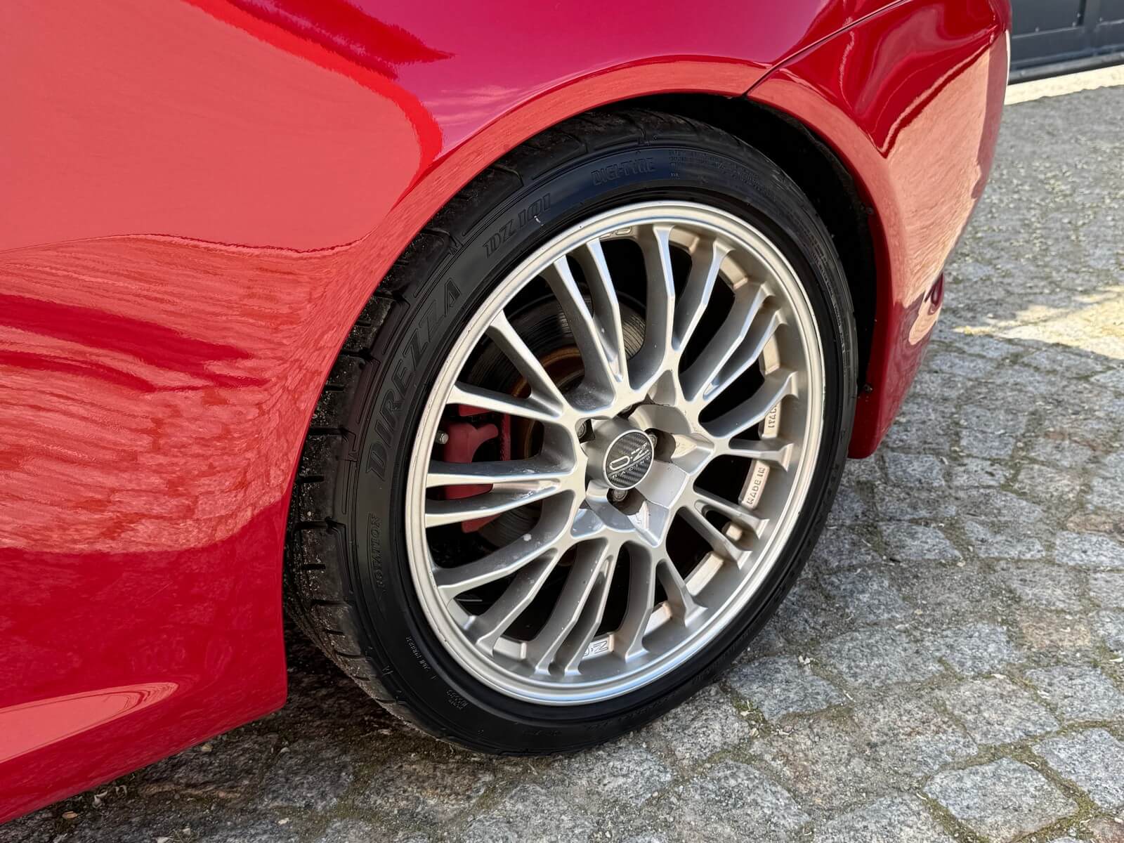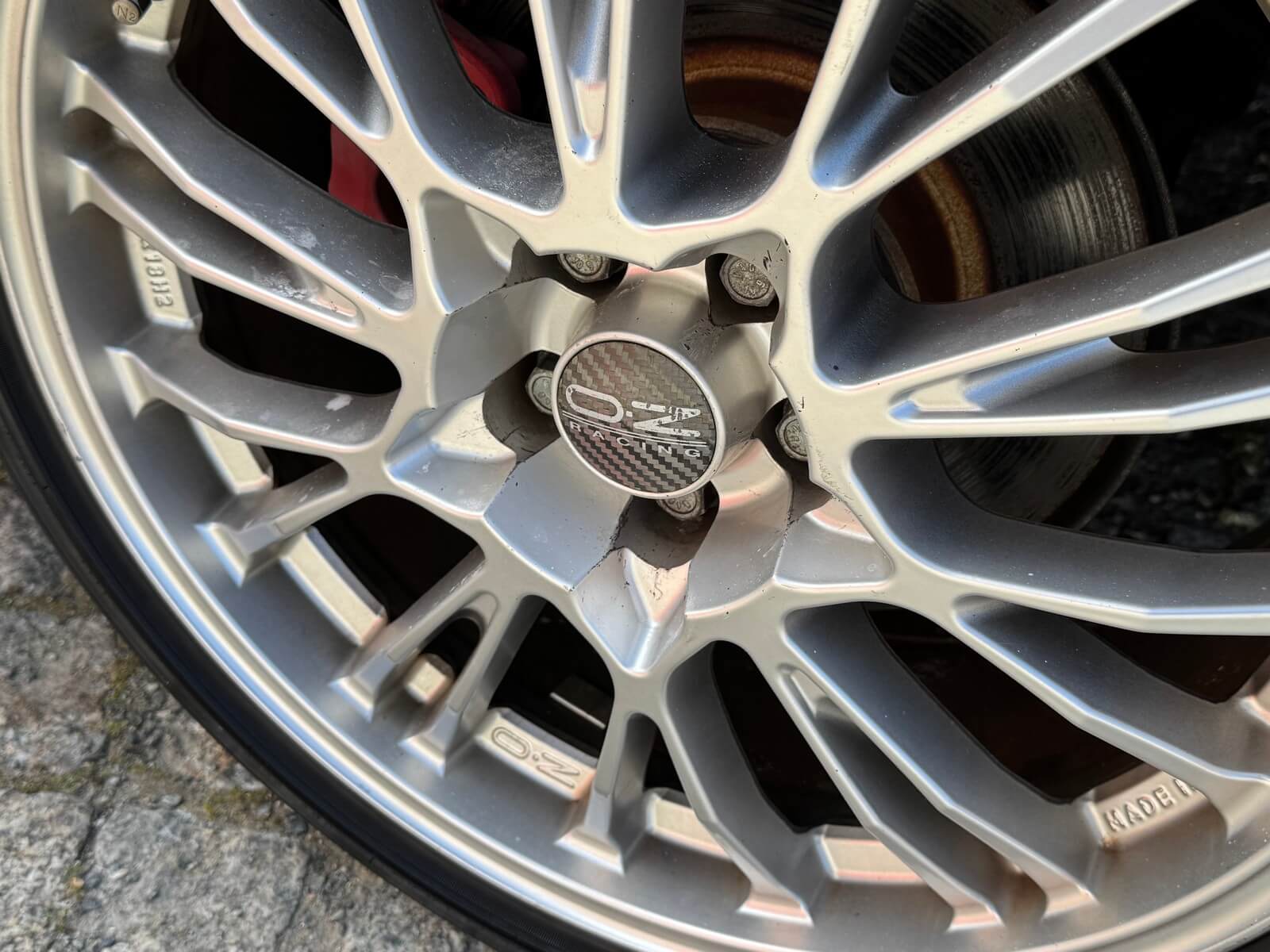 Alufelgi OZ w stanie dobrym bez uszkodzeń, mają kilka odprysków na rantach. Komplet opon letnich.
