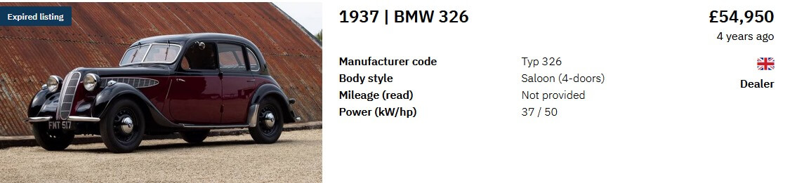 Oferta sprzedaży dotyczy samochodu BMW 326 z roku 1938. Jest to samochód osobowy klasy średniej produkowany przez niemiecką firmę BMW w latach 1936-1941 i w krótkiej serii w roku 1945. Następca modelu 319. BMW 326 dostępne było jako 4-drzwiowy sedan oraz 2- lub 4-drzwiowy kabriolet. Do zawieszenia produkcji w 1941 powstało 15.949 egzemplarzy modelu. a szacuje się, że na skutek działań wojennych do dziś przetrwała ich zaledwie garstka, co czyni go niezwykle rzadkim i wyjątkowym autem.