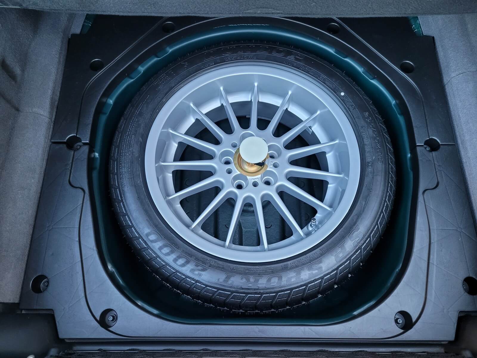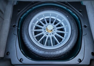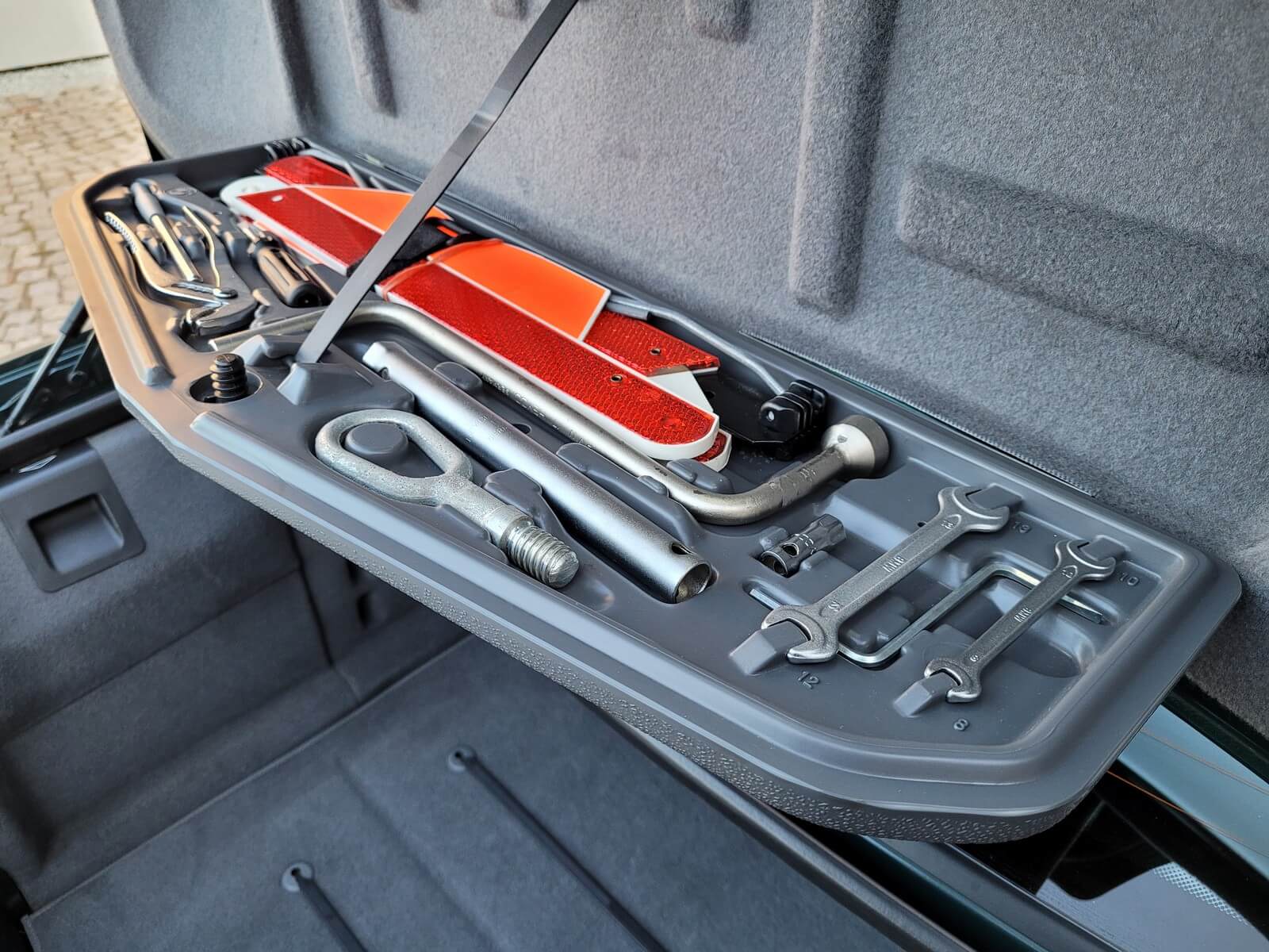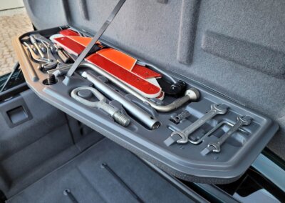 Wyposażenie bagażnika kompletne jak pierwszego dnia, zestaw oryginalnych narzędzi, paski do mocowania bagażu, koło zapasowe z fabryczną nigdy nie użytą oponą, brak nalotu rdzy czy uszkodzeń.