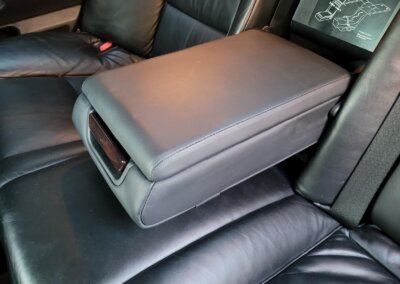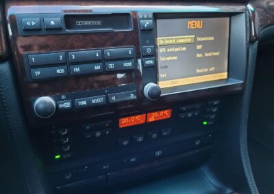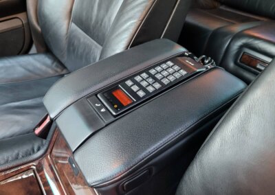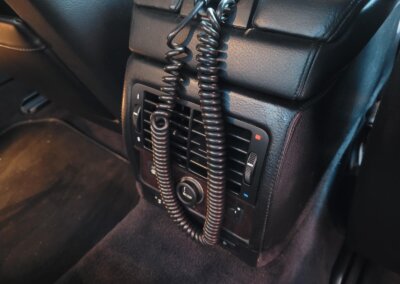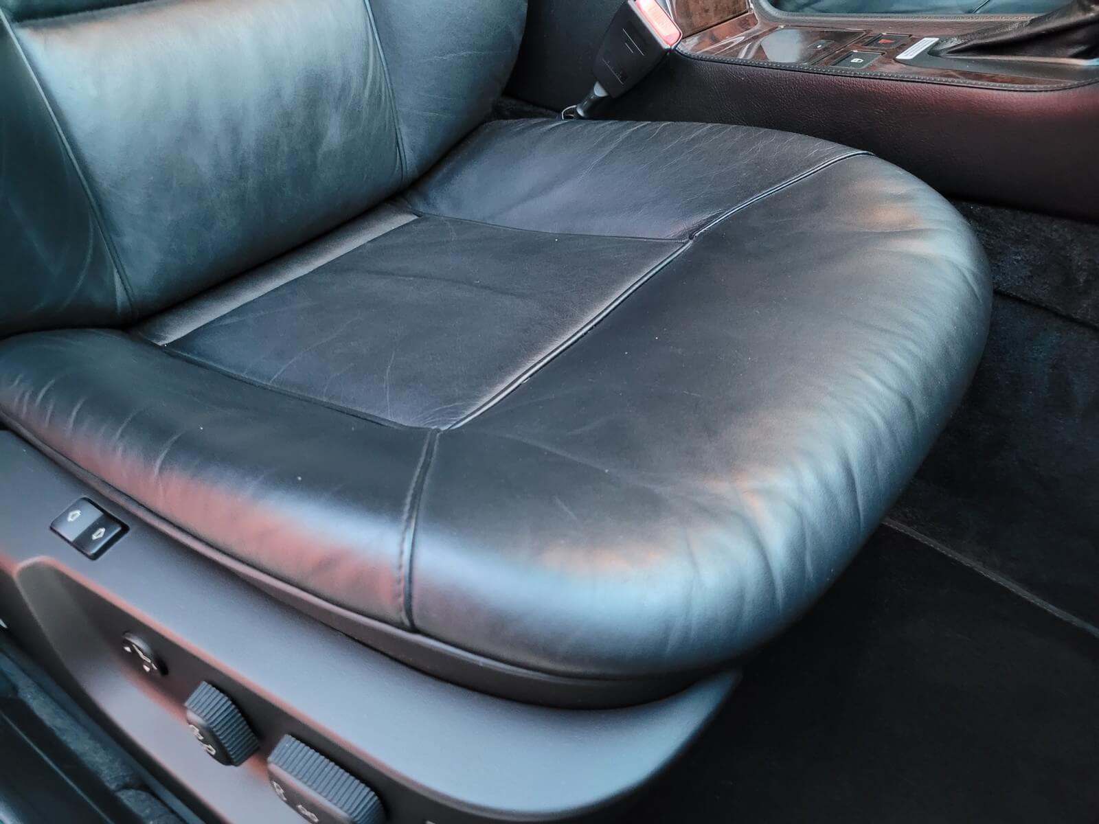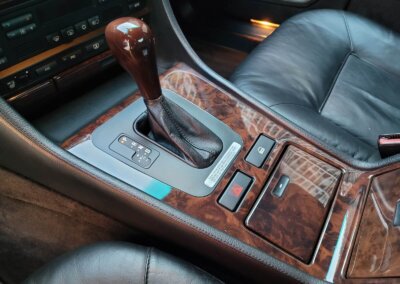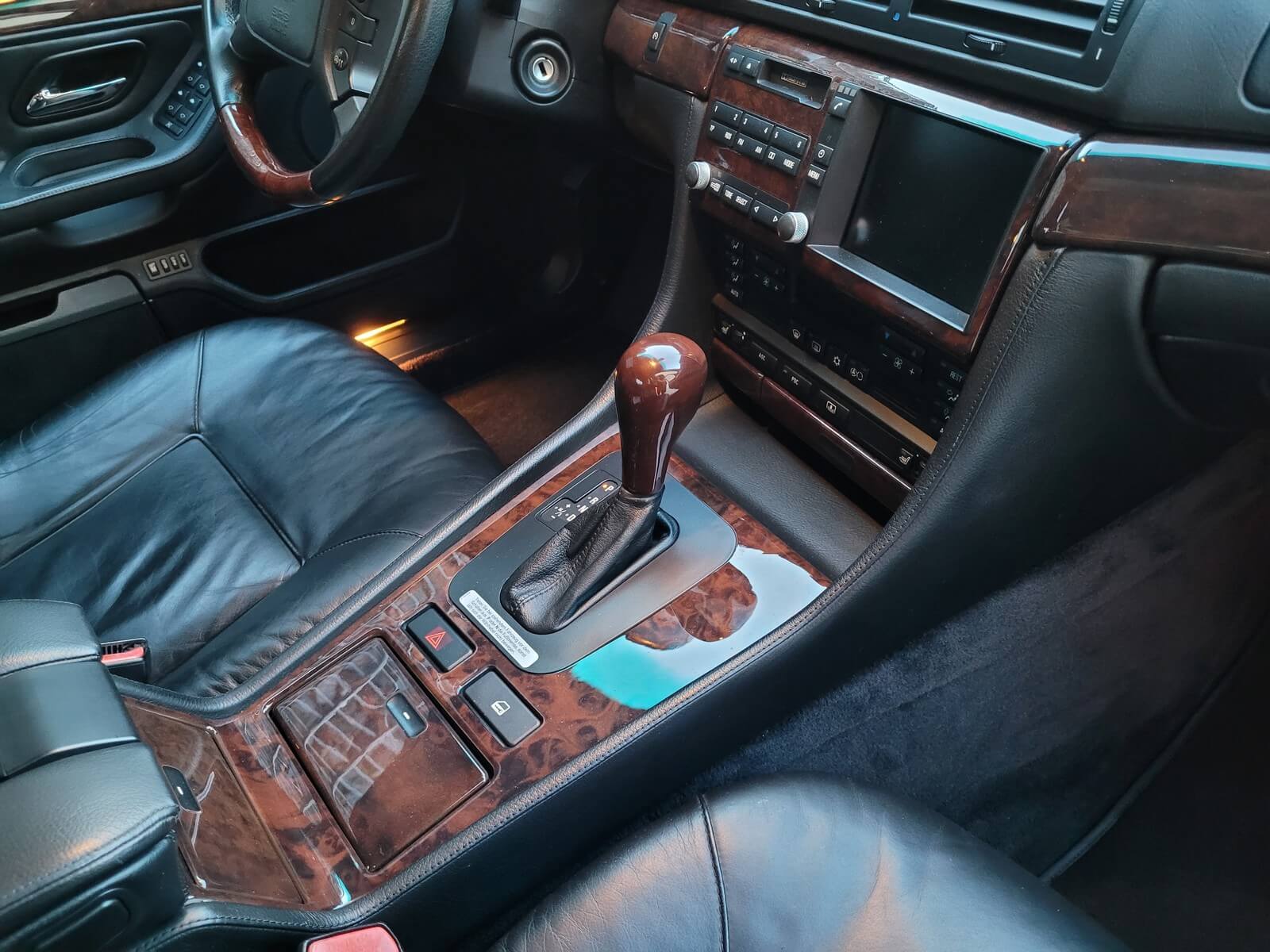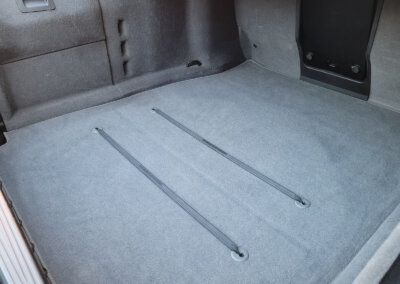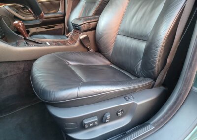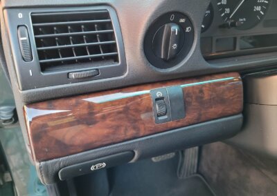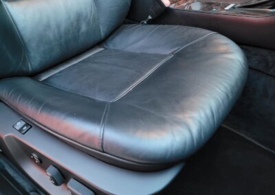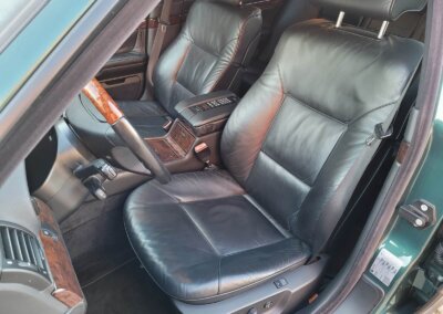 Wnętrze jest kompletne, zachowane w bardzo dobrym stanie, z niewielkimi śladami użytkowania. Tapicerka foteli i boczków są zadbane, nie posiadają uszkodzeń czy przetarć. Drewno w idealnym stanie, ma wciąż żywy kolor. Plastiki matowe. Podsufitka jak nowa. Wyświetlacze bez martwych pikseli. Oryginalny zestaw dywaników welurowych.