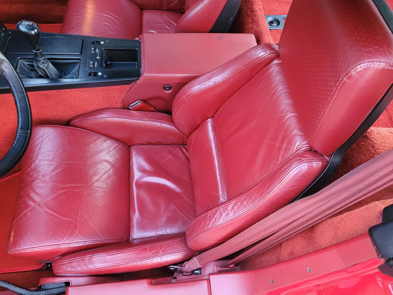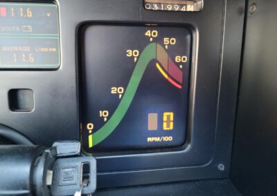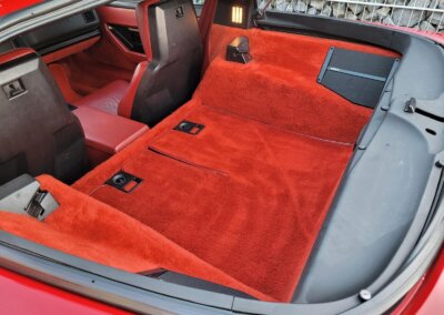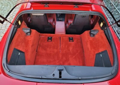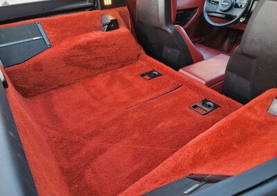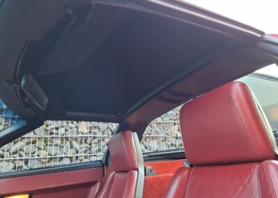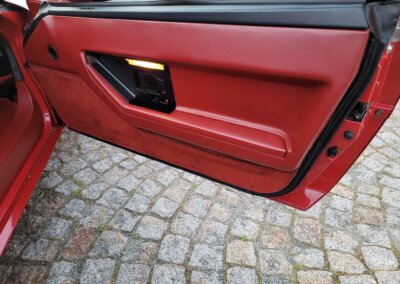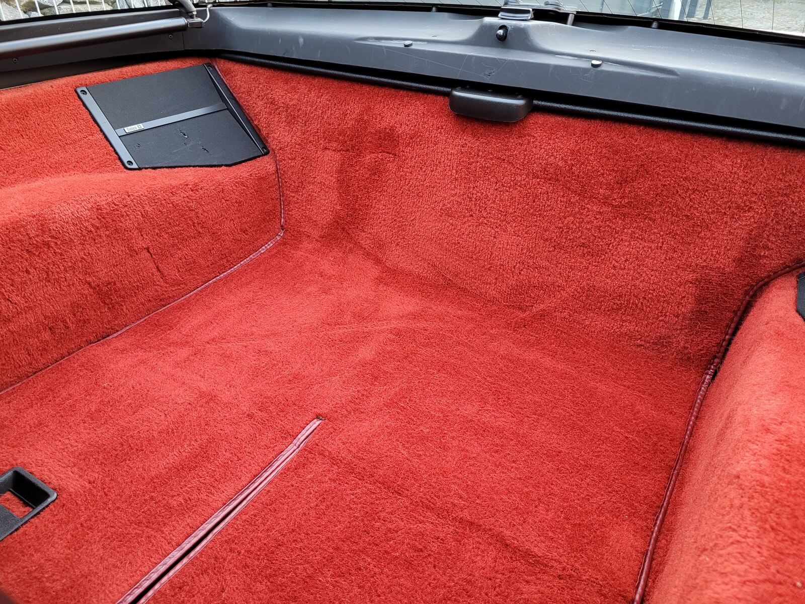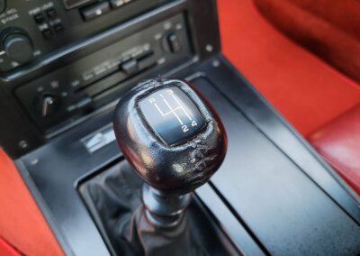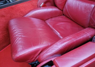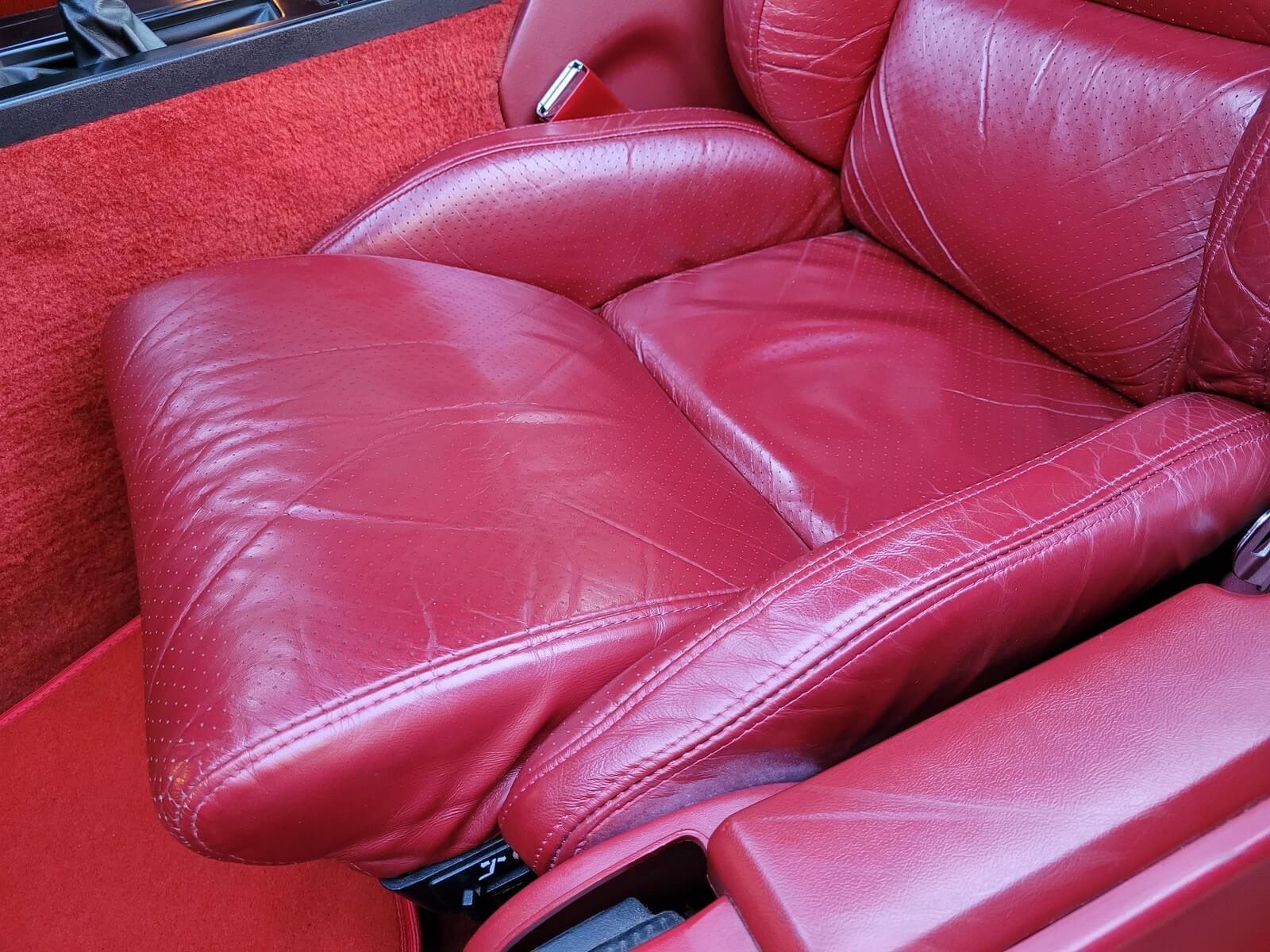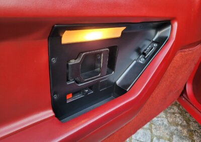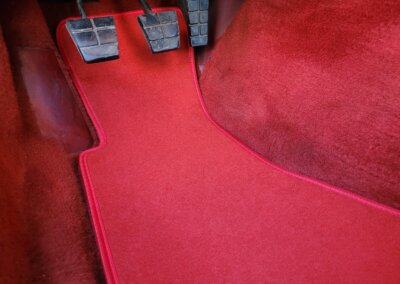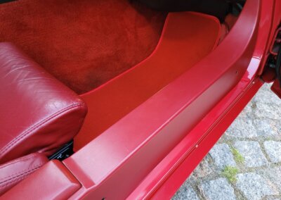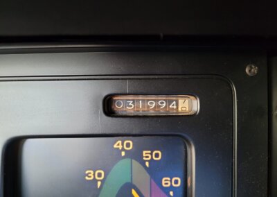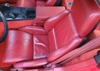 Wnętrze jest kompletne, bez żadnych widocznych uszkodzeń. Skórzana tapicerka zachowana w idealnym stanie, bez przetarć. Jest wciąż miękka, bez jakichkolwiek śladów zużycia. Wszystkie elementy wyposażenia zdają się być sprawne. Kierownica i wyberak biegów oryginalne w stanie dziewiczym. Komplet nowych dywaników welurowych, pod spodem oryginalne w idealnym stanie.