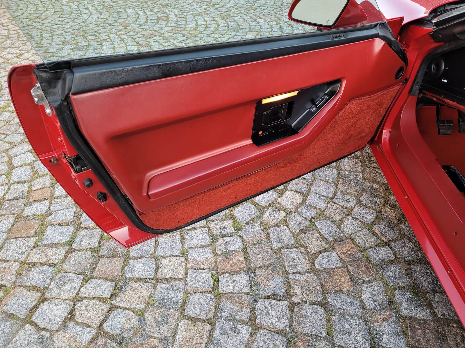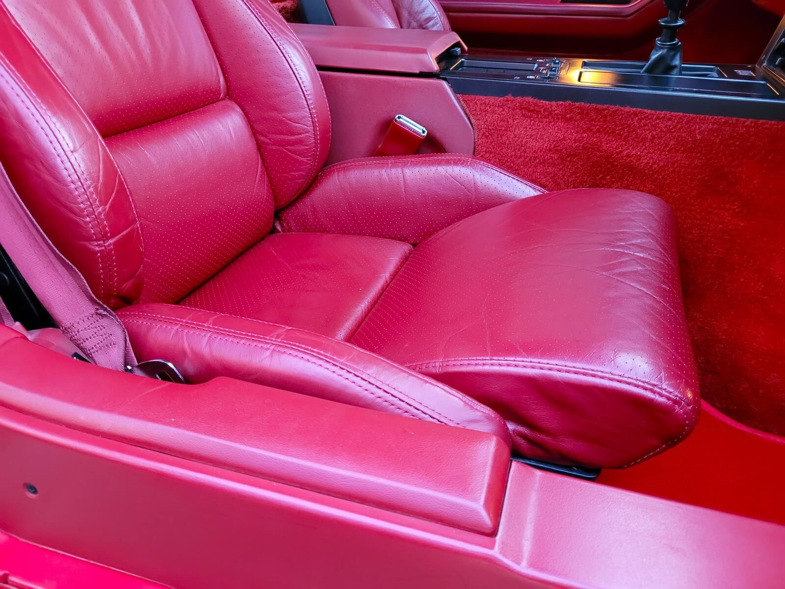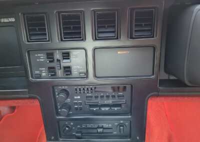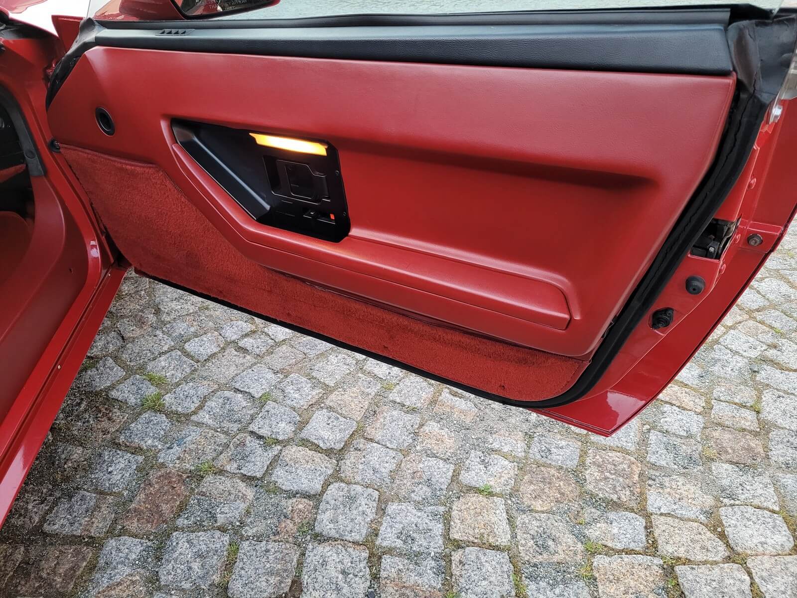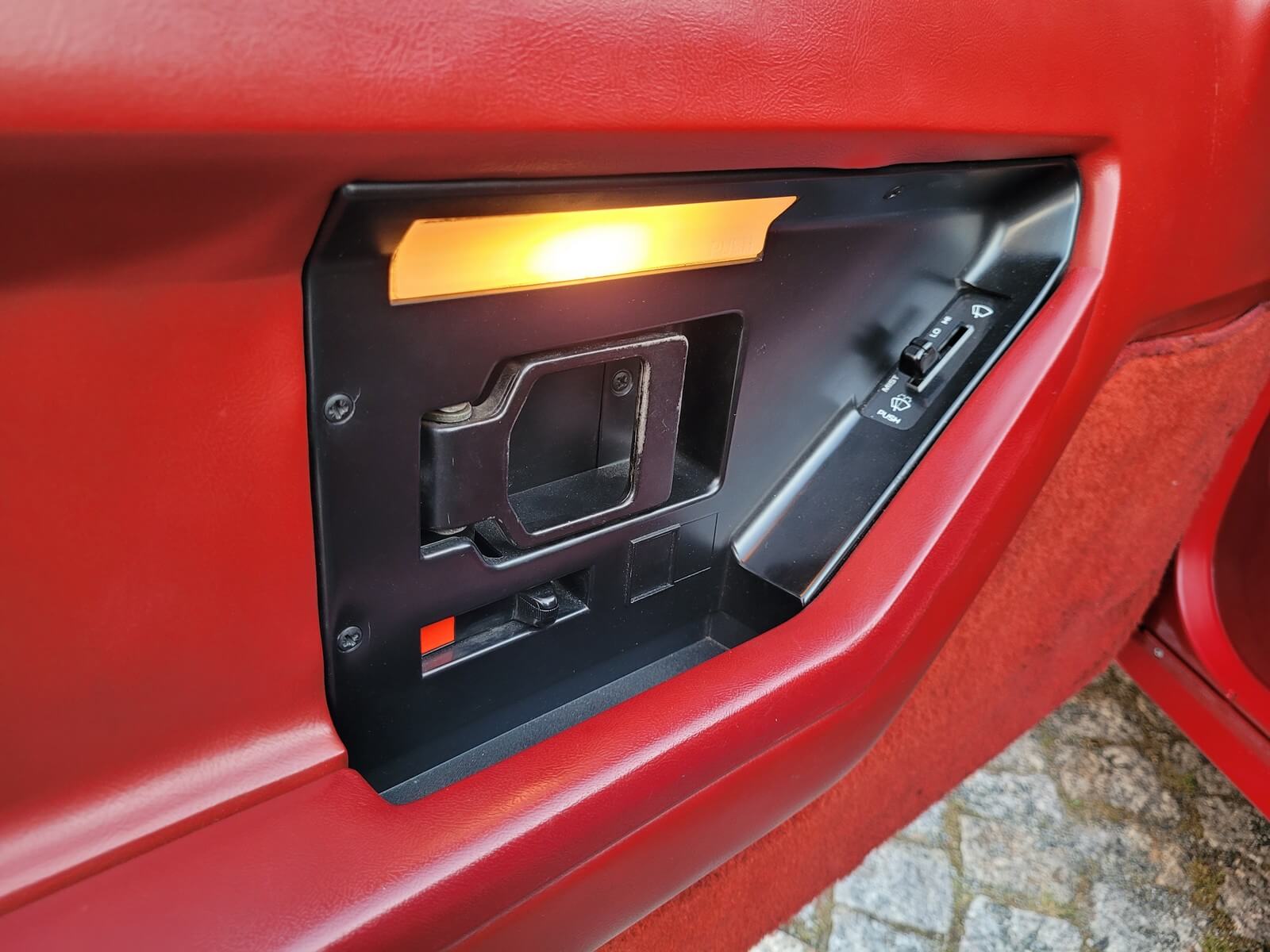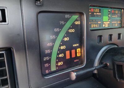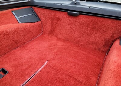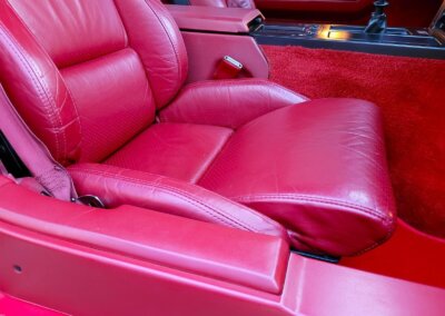 Wnętrze jest kompletne, bez żadnych widocznych uszkodzeń. Skórzana tapicerka zachowana w idealnym stanie, bez przetarć. Jest wciąż miękka, bez jakichkolwiek śladów zużycia. Wszystkie elementy wyposażenia zdają się być sprawne. Kierownica i wyberak biegów oryginalne w stanie dziewiczym. Komplet nowych dywaników welurowych, pod spodem oryginalne w idealnym stanie.