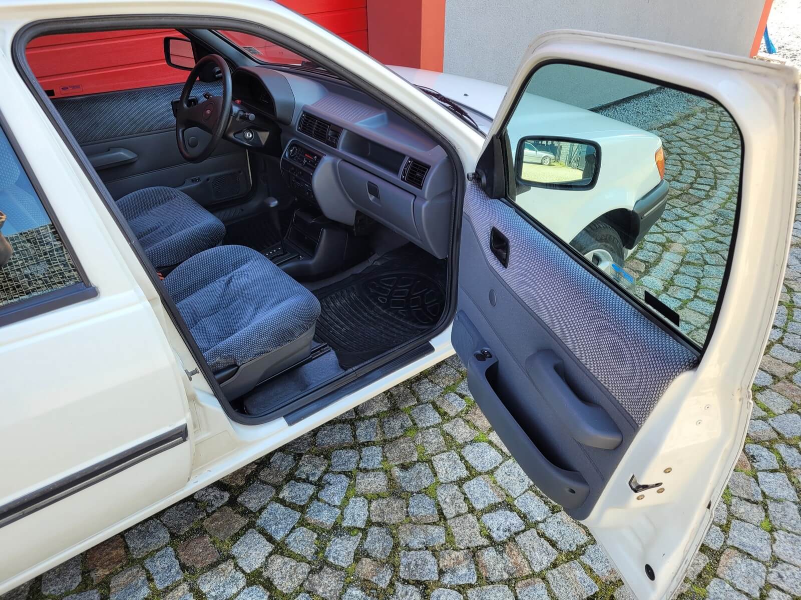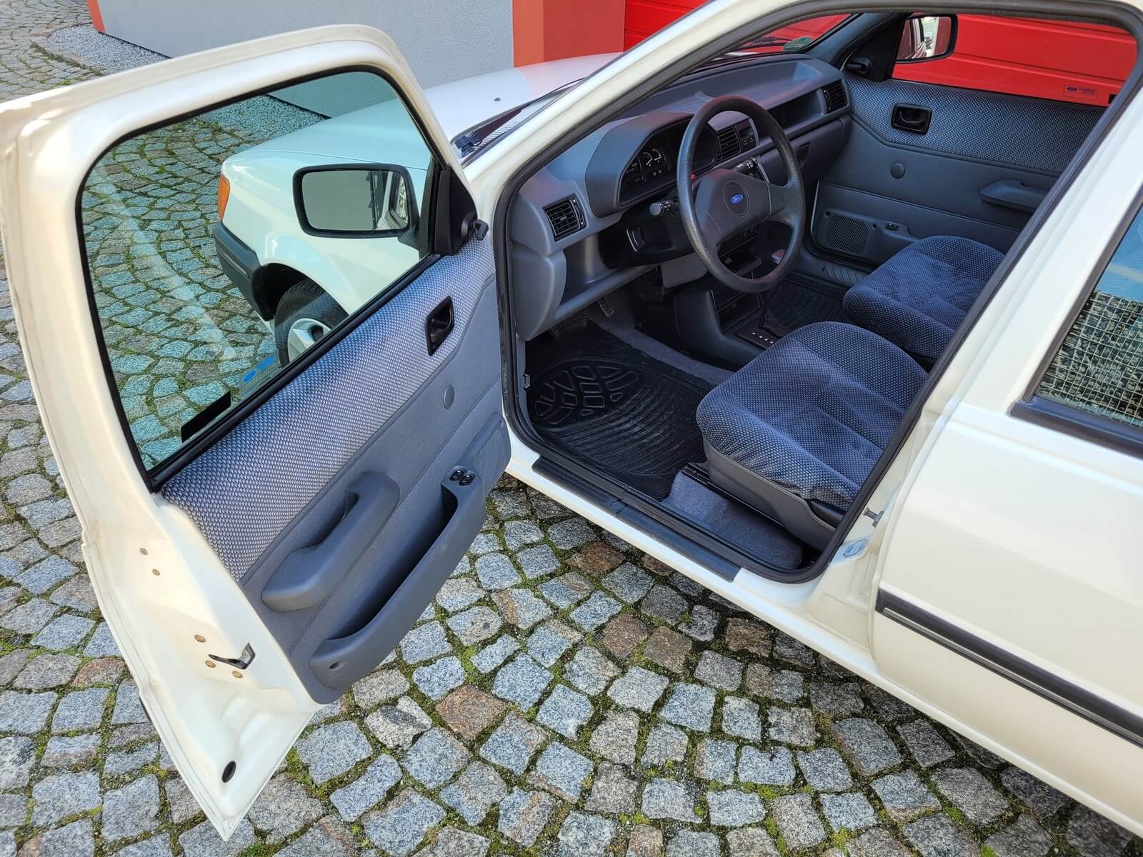 Przedmiotem sprzedaży jest Ford Fiesta trzeciej generacji w kolorze białym z szarą welurową tapicerką. Wyposażona w el. szyby i automatyczną skrzynię biegów.