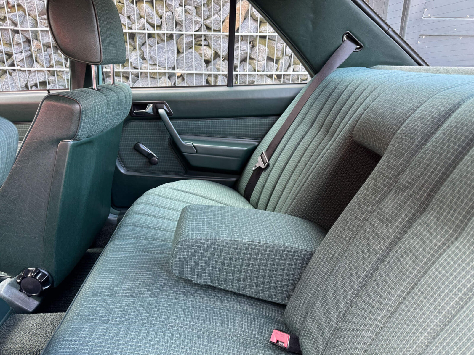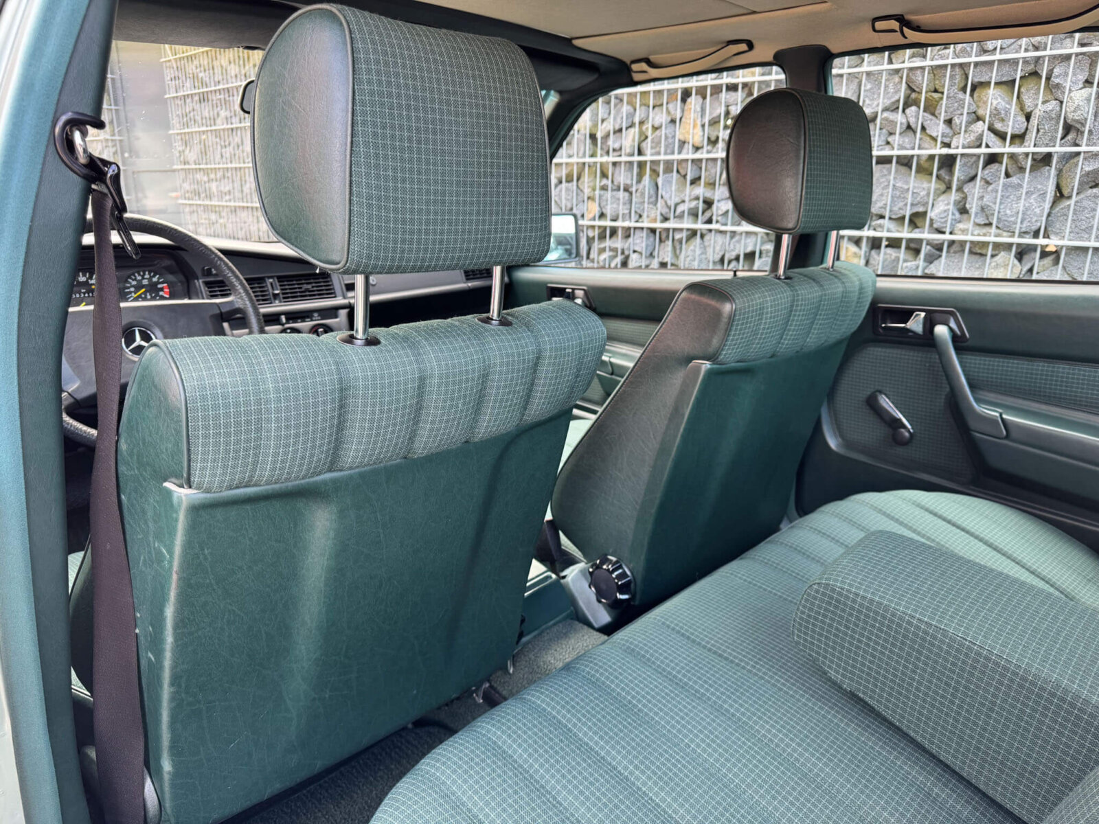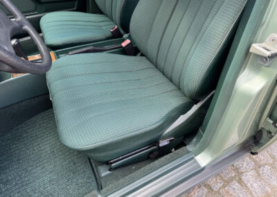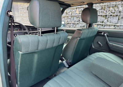 Wnętrze zachowane w bardzo dobrym stanie z minimalnymi śladami użytkowania. Materiałowa tapicerka prezentuje się nadzwyczajnie, nie ma uszkodzeń, ma wciąż żywy kolor. Fotele i wykładziny wyglądają dalej jak nowe. Boczki drzwi w stanie idealnym jak na w201. Radio Blaupunkt kasetowe z anteną manualną, nowe głośniki. Piękne zielone dywaniki rypsowe. Kierownica i wybierak biegów mają drobne ślady użytkowania. Podsufitka jak nowa.