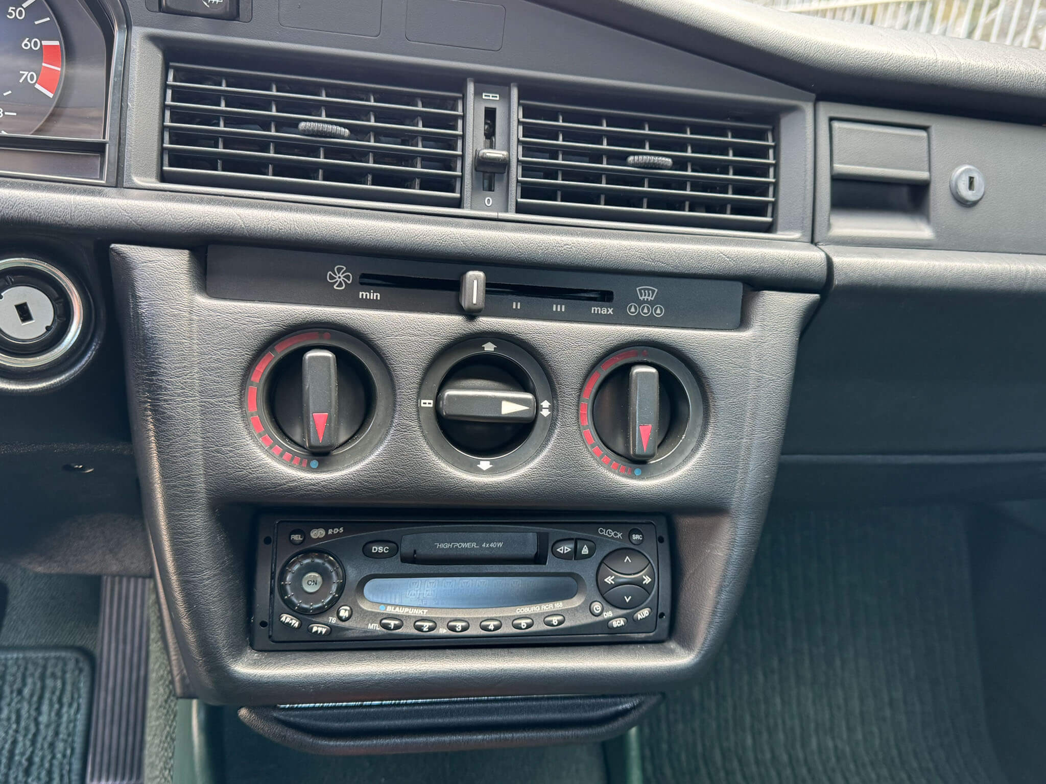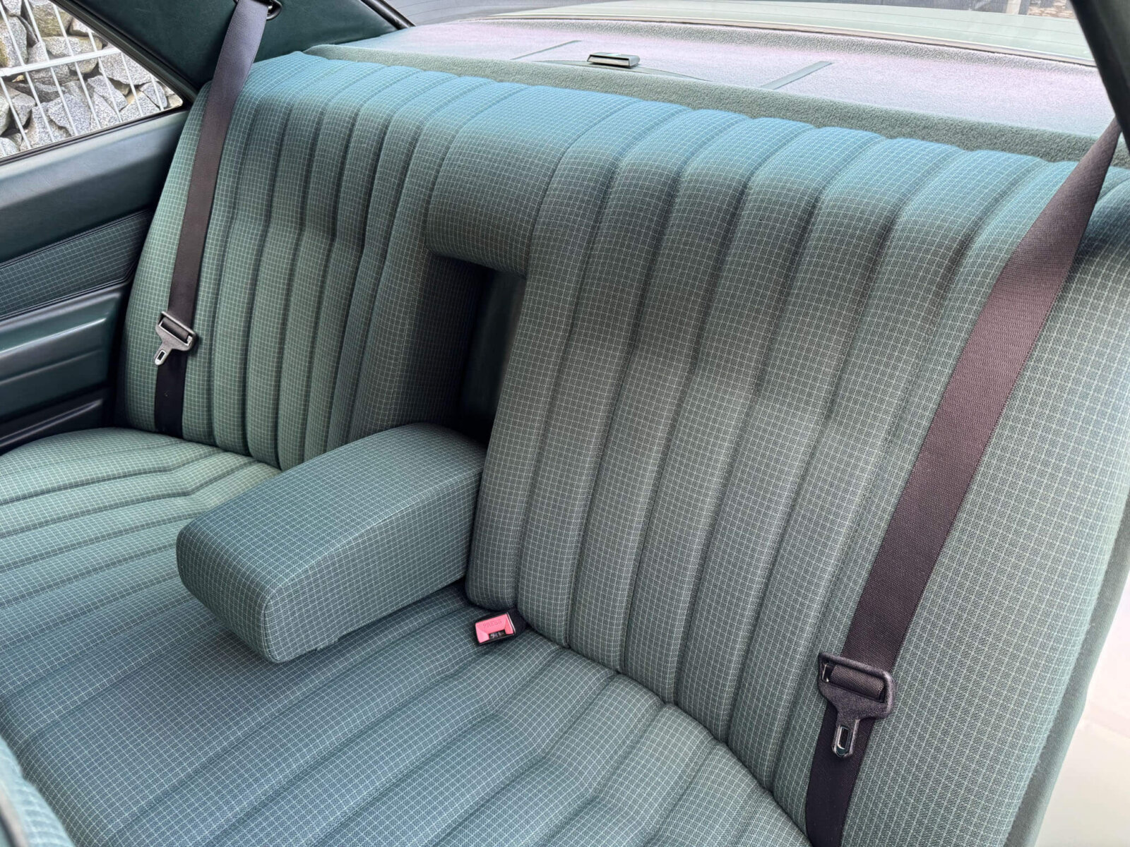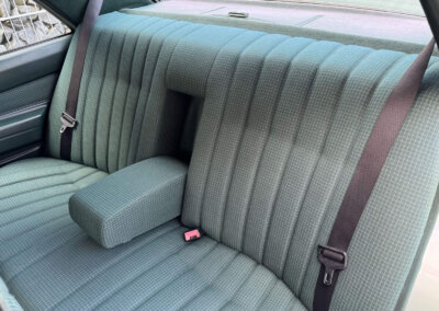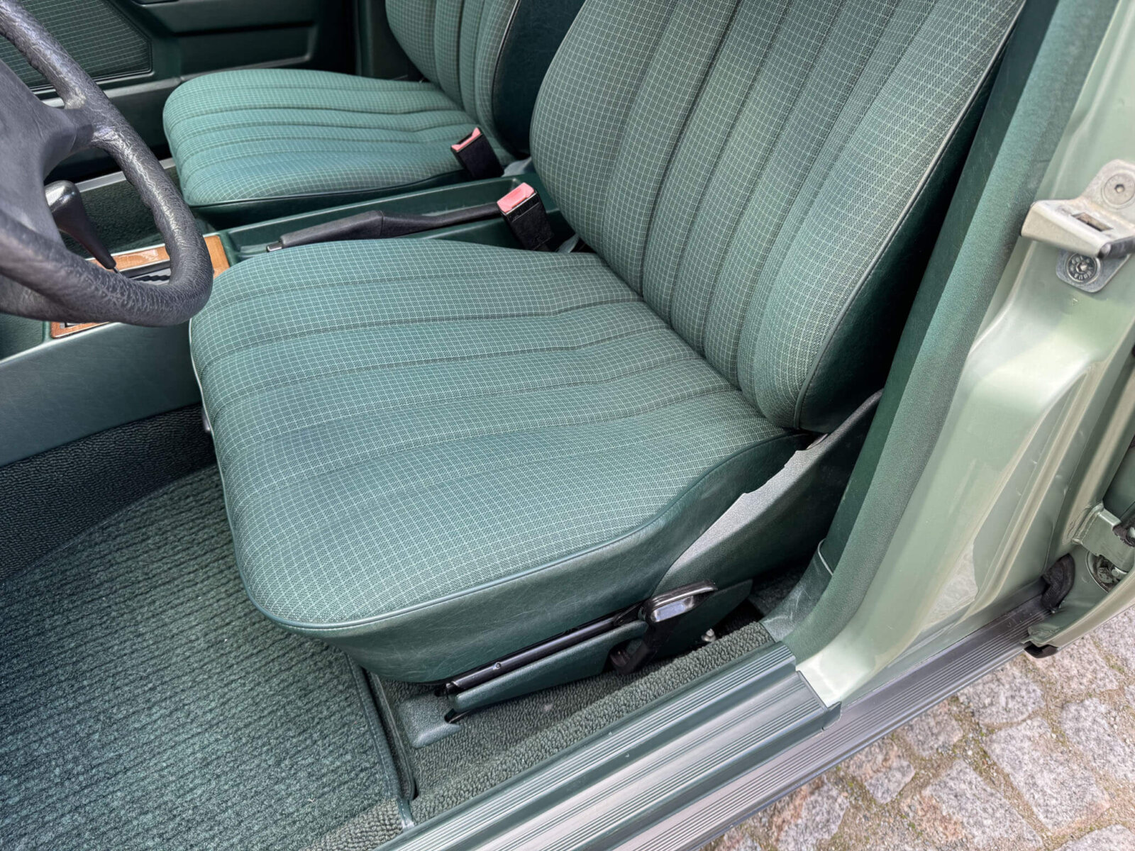 Wnętrze zachowane w bardzo dobrym stanie z minimalnymi śladami użytkowania. Materiałowa tapicerka prezentuje się nadzwyczajnie, nie ma uszkodzeń, ma wciąż żywy kolor. Fotele i wykładziny wyglądają dalej jak nowe. Boczki drzwi w stanie idealnym jak na w201. Radio Blaupunkt kasetowe z anteną manualną, nowe głośniki. Piękne zielone dywaniki rypsowe. Kierownica i wybierak biegów mają drobne ślady użytkowania. Podsufitka jak nowa.