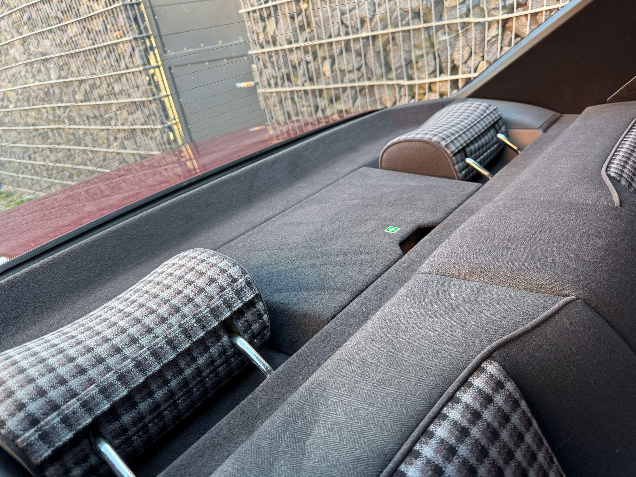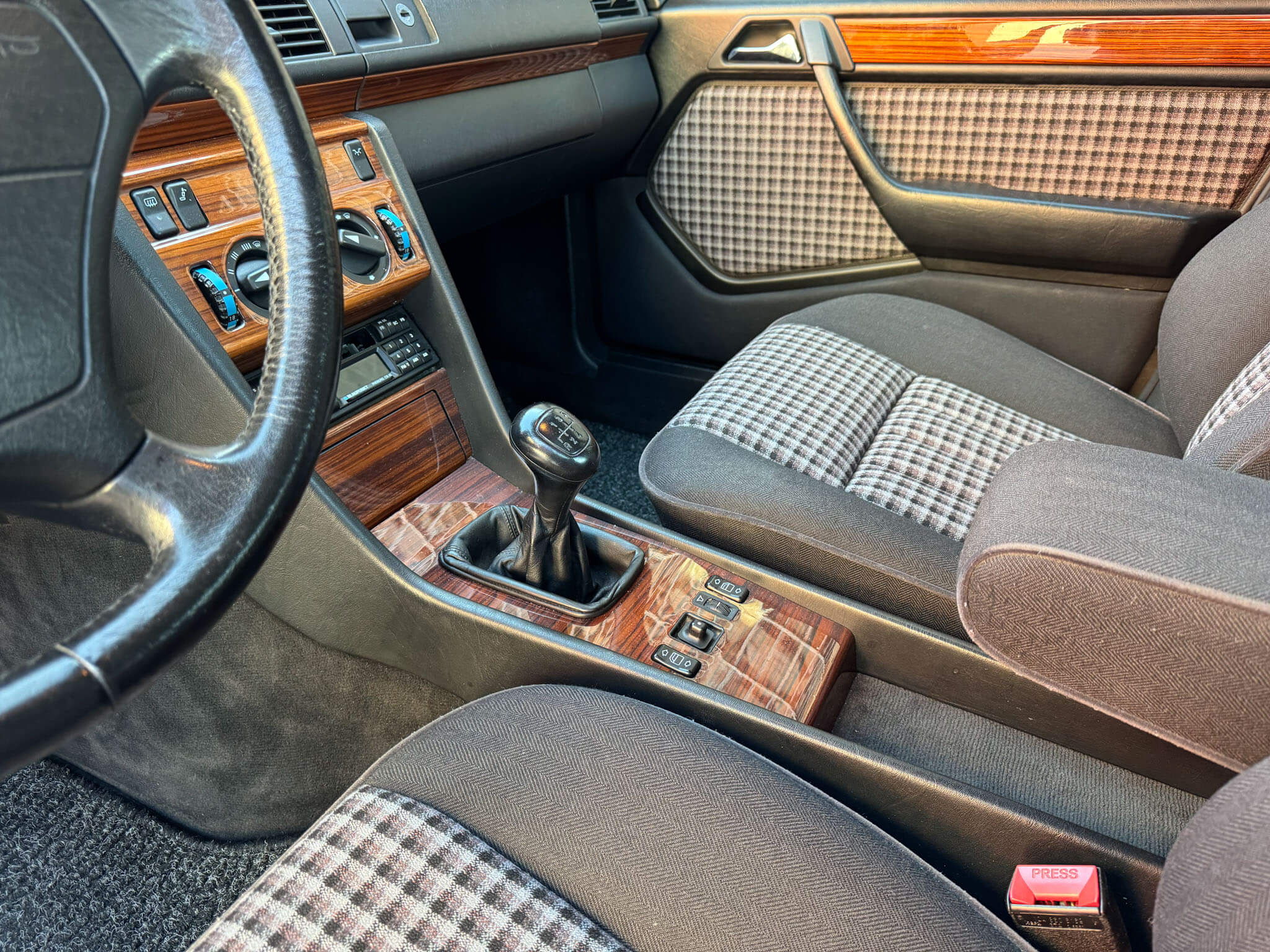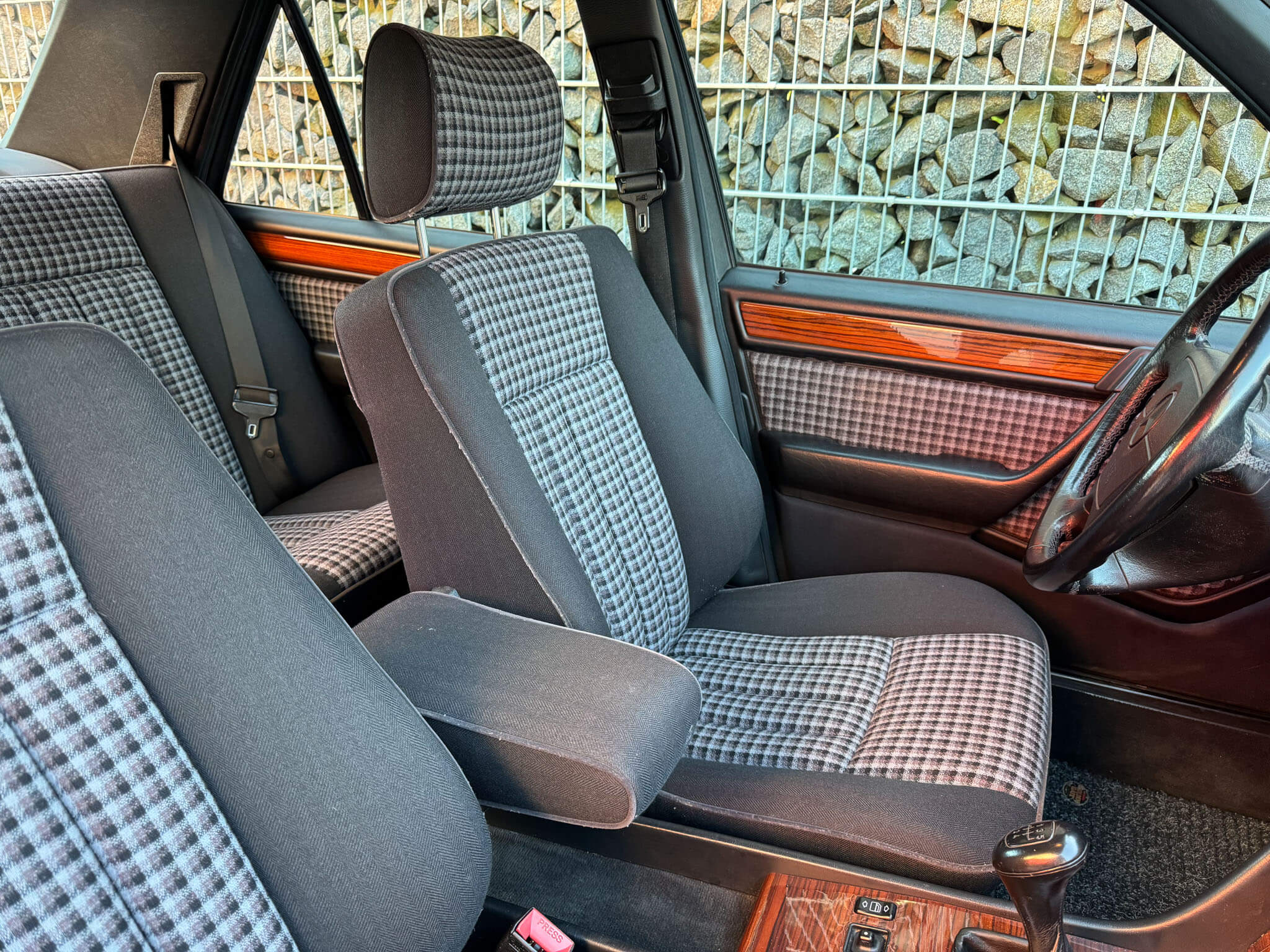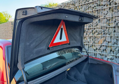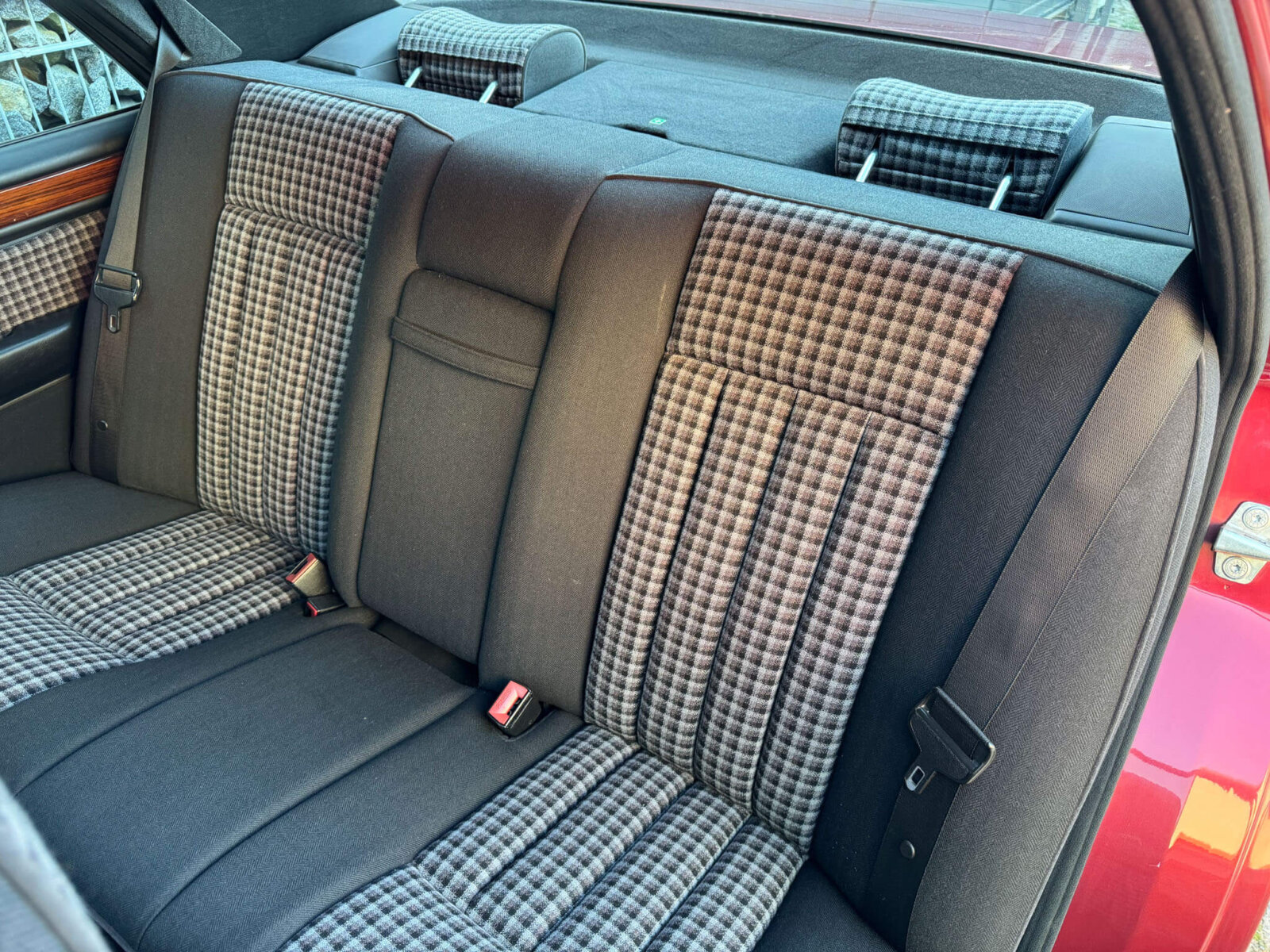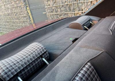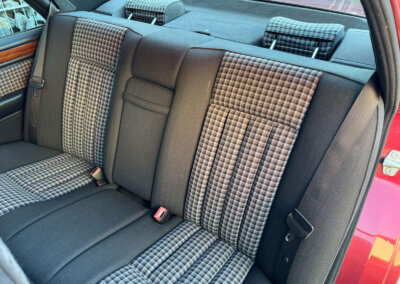 Wnętrze zachowane w idealnym stanie, widoczne jedynie minimalne ślady użytkowania. Materiałowa tapicerka jest wciąż jak nowa, bez przetarć czy uszkodzeń. Żadne elementy nie były obszywane. Oryginalne radio Blaupunkt. Dywaniki Rypsowe Hoersteller. Elementy drewniane w idealnym stanie, mają bardzo żywy kolor i są wolne od pęknięć. Plastiki matowe bez rys czy pęknięć. Skórzana kierownica i wybierak idealnie utrzymane, nie obszywane ani nie regenerowane. Brak uszkodzeń od słońca czy wilgoci.