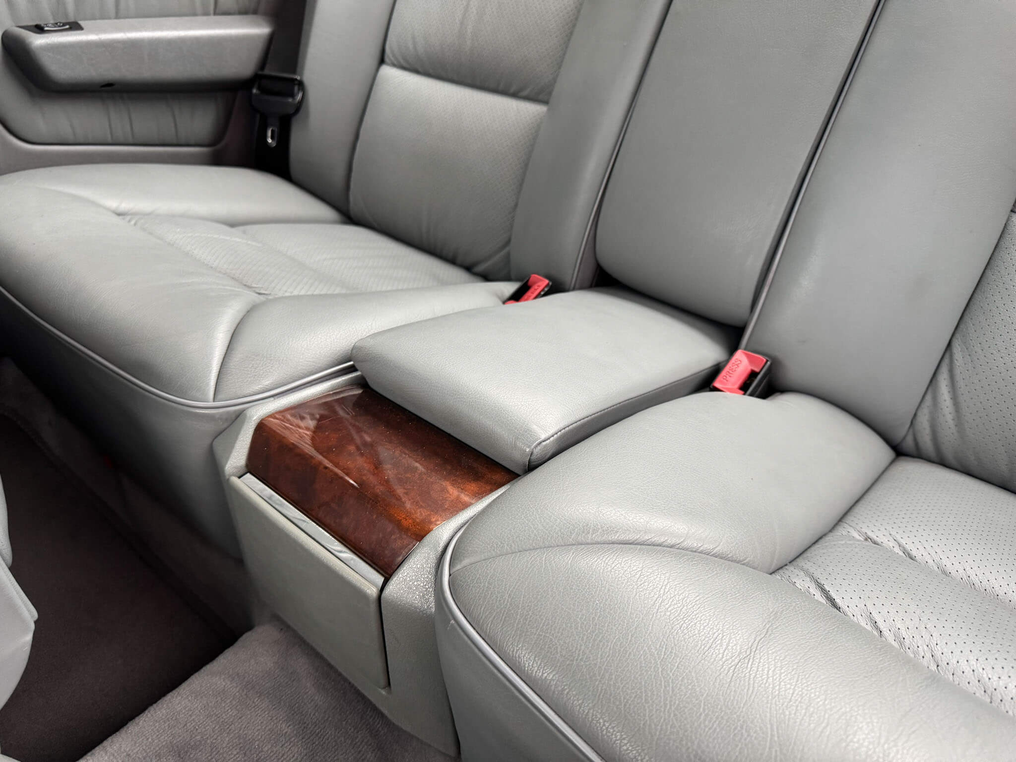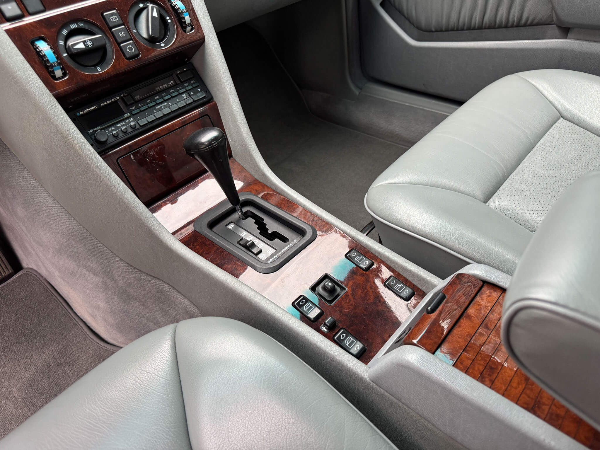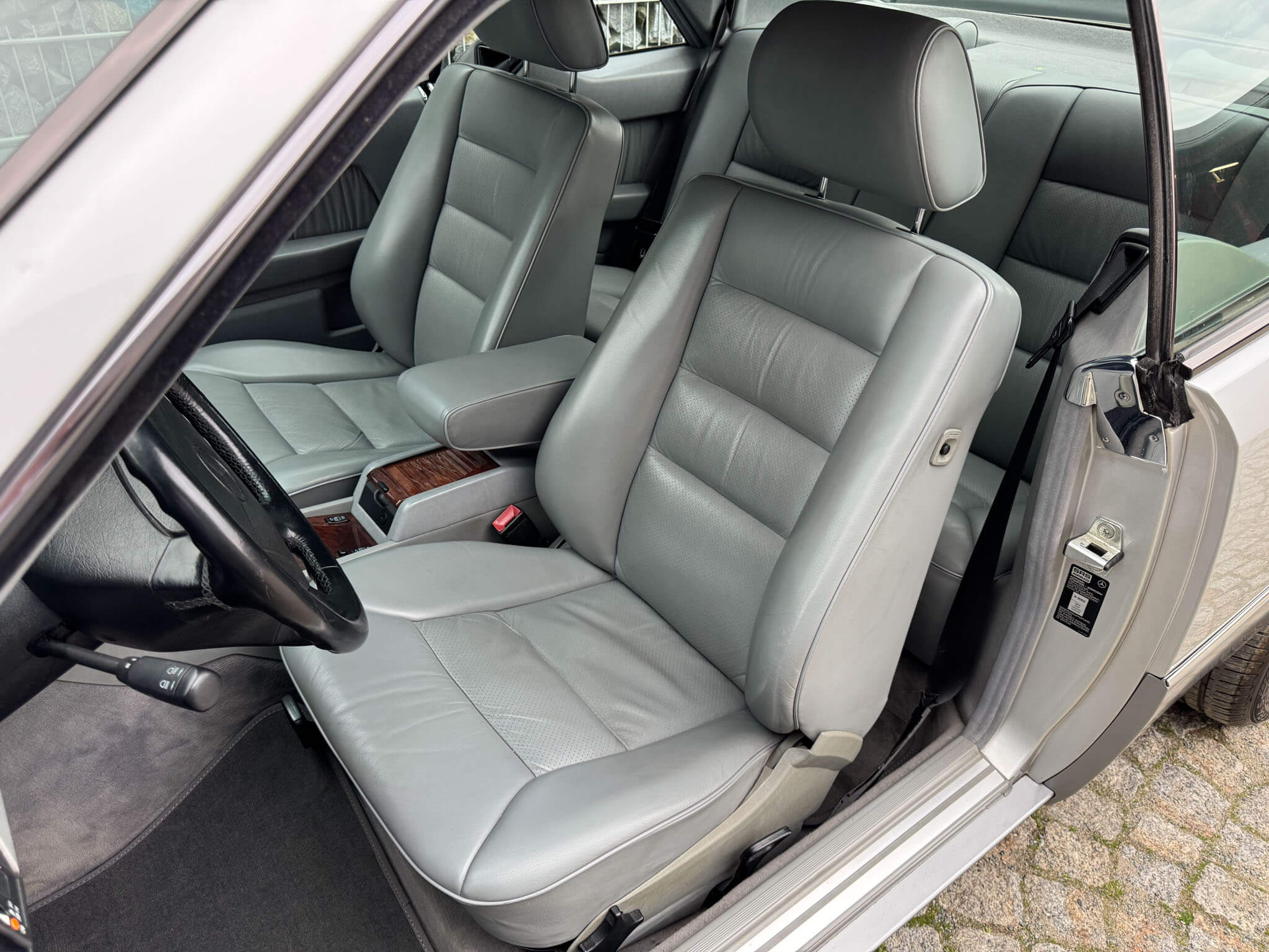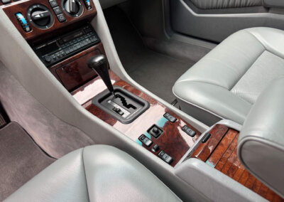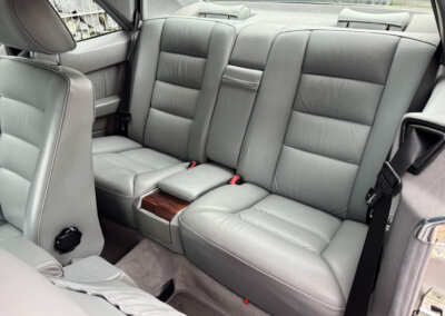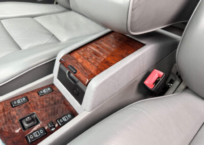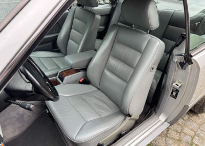 Wnętrze zachowane w bardzo dobrym stanie, widoczne jedynie minimalne ślady użytkowania. Skórzana tapicerka jest wciąż miękka i matowa, bez przetarć czy uszkodzeń. Żadne elementy nie były obszywane czy poddawane regeneracji. Oryginalne radio Blaupunkt Montreux. Dwa zestawy oryginalnych dywaników, rypsowe oraz gumowe. Elementy drewniane w niesamowitym stanie, jak nowe, mają bardzo żywy kolor. Podsufitka jak nowa. Plastiki matowe bez rys czy pęknięć. Skórzana kierownica i wybierak idealnie utrzymane, nie obszywane ani nie regenerowane. Schowek z drewnianą roletką pod podłokietnikiem. Fabryczne przygotowanie do telefonu – instalacja i antena.