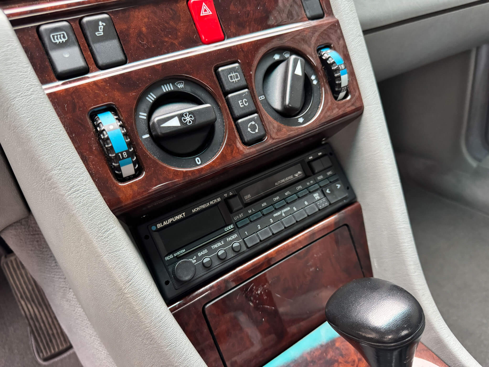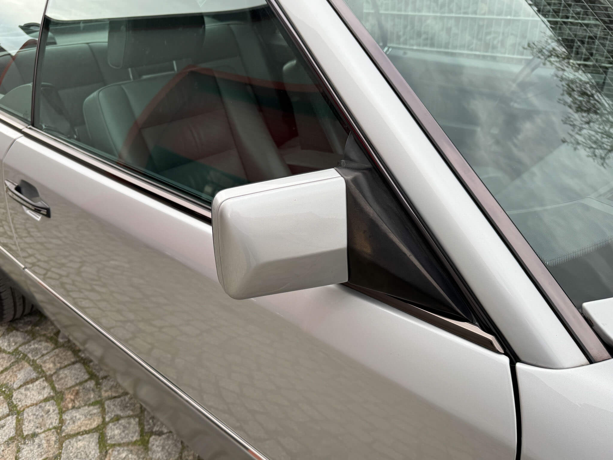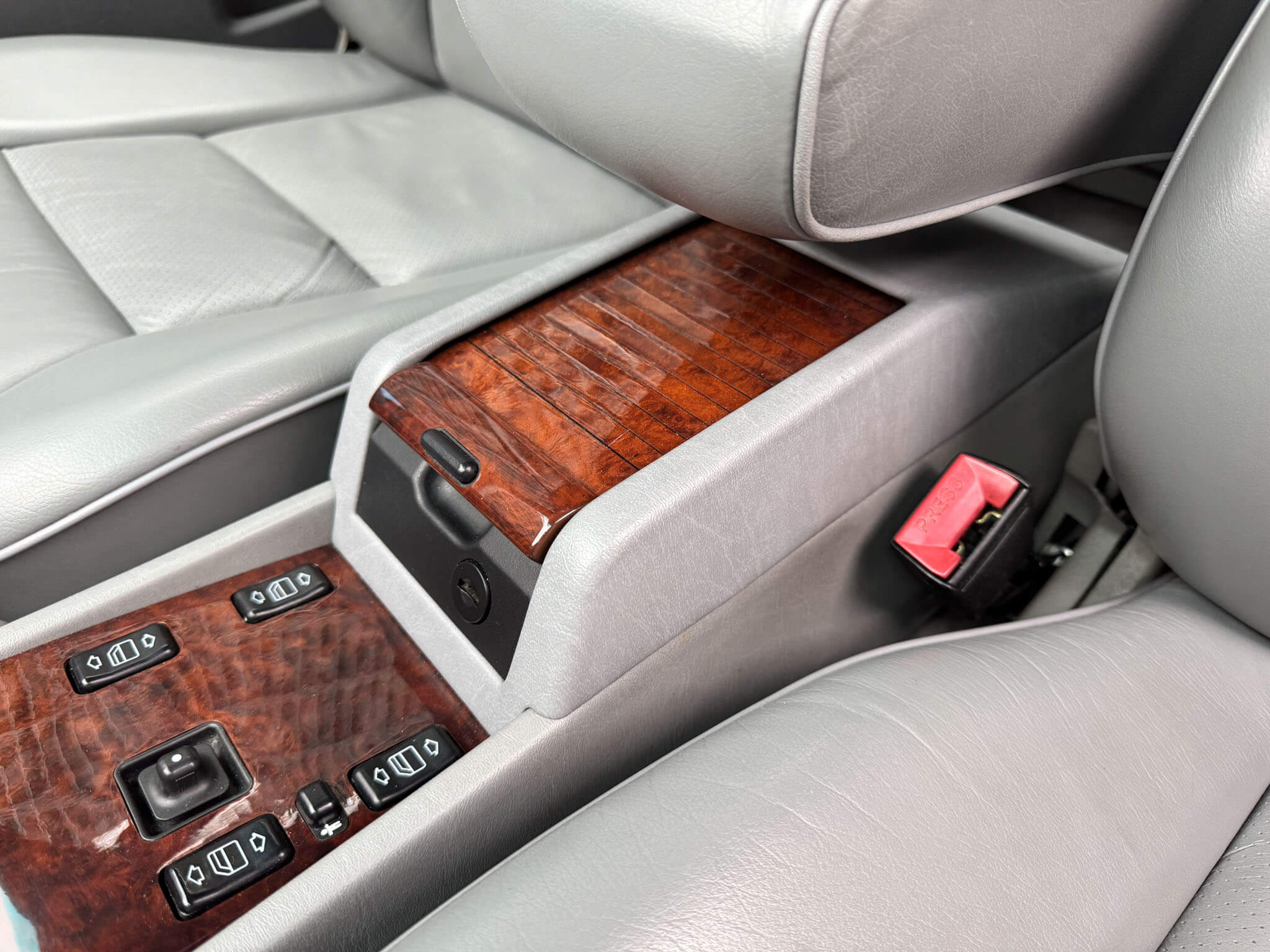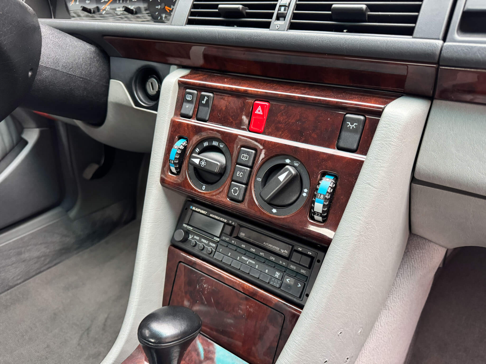 Wnętrze zachowane w bardzo dobrym stanie, widoczne jedynie minimalne ślady użytkowania. Skórzana tapicerka jest wciąż miękka i matowa, bez przetarć czy uszkodzeń. Żadne elementy nie były obszywane czy poddawane regeneracji. Oryginalne radio Blaupunkt Montreux. Dwa zestawy oryginalnych dywaników, rypsowe oraz gumowe. Elementy drewniane w niesamowitym stanie, jak nowe, mają bardzo żywy kolor. Podsufitka jak nowa. Plastiki matowe bez rys czy pęknięć. Skórzana kierownica i wybierak idealnie utrzymane, nie obszywane ani nie regenerowane. Schowek z drewnianą roletką pod podłokietnikiem. Fabryczne przygotowanie do telefonu – instalacja i antena.
