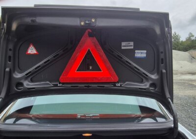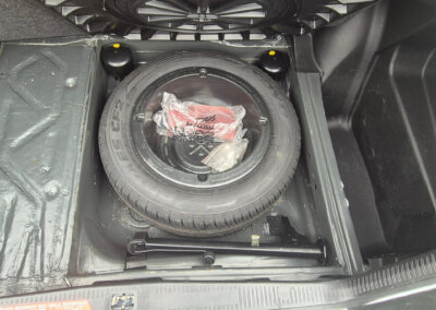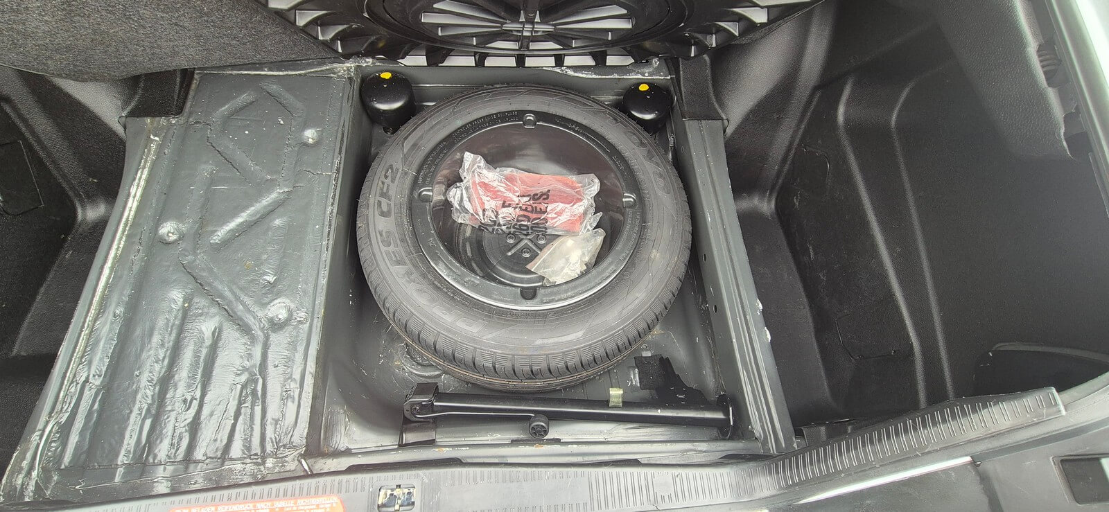 Wyposażenie bagażnika kompletne, nieużywane koło zapasowe. Narzędzia wciąż zapakowane w folię. Tapicerka bagażnika nie posiada uszkodzeń.