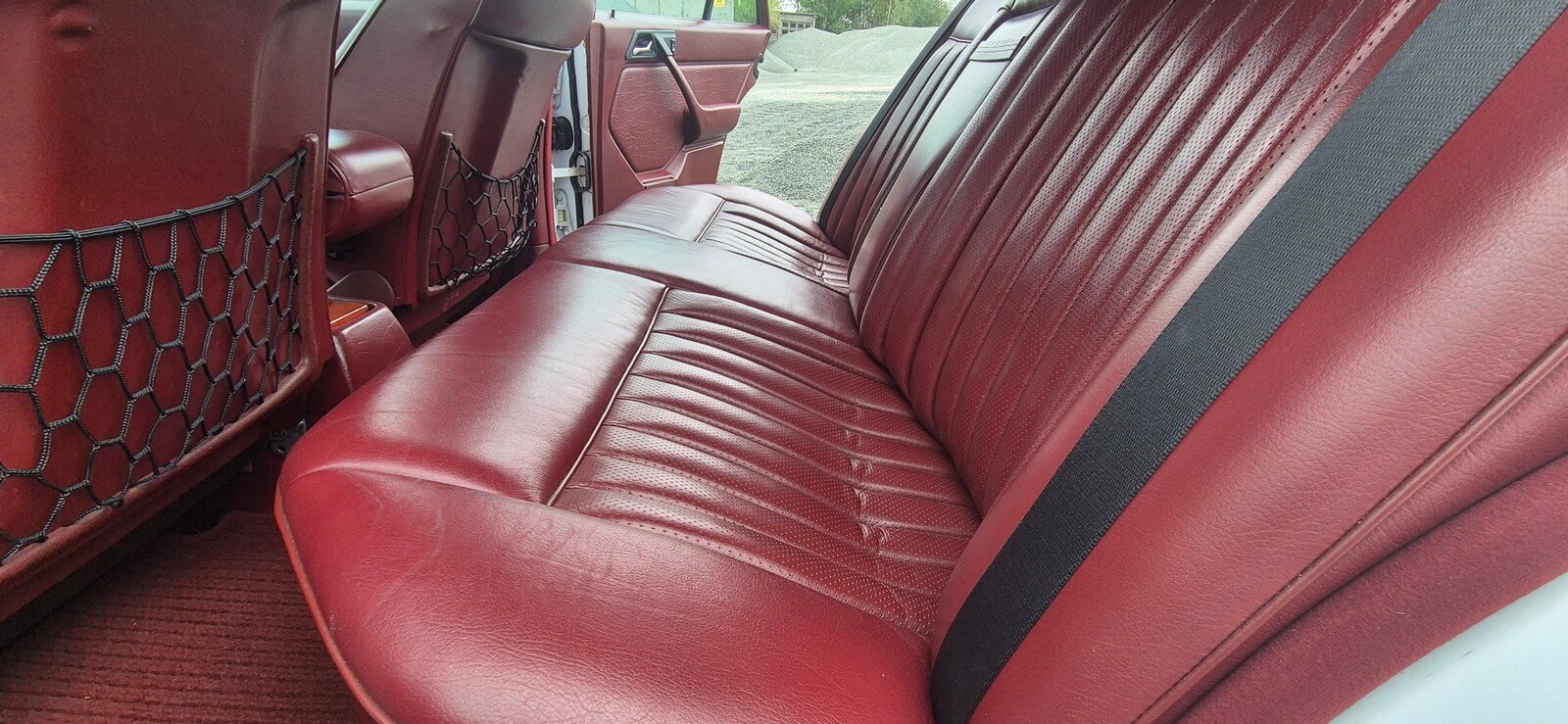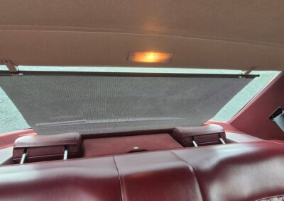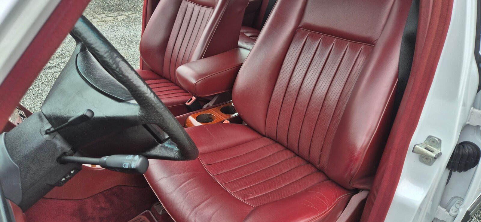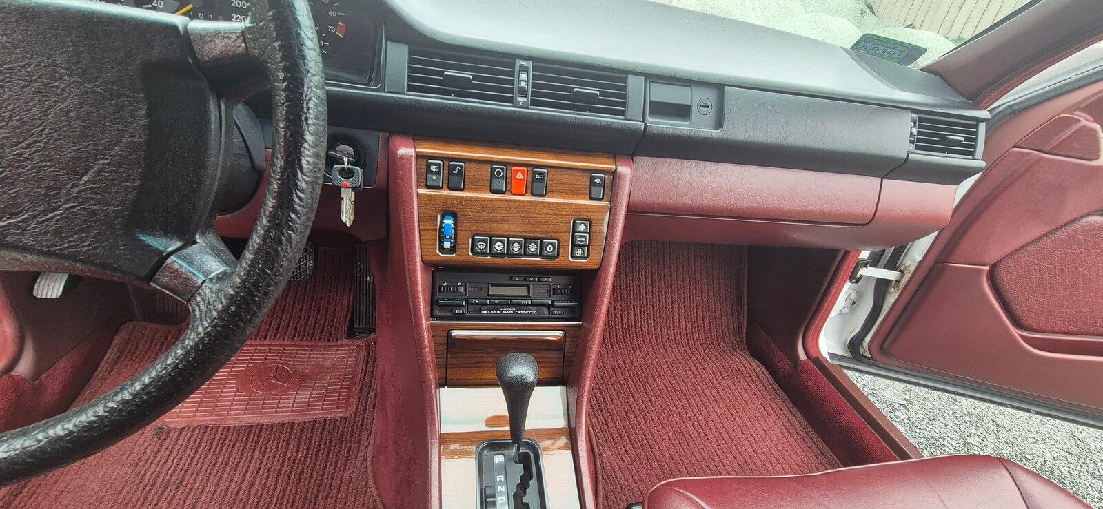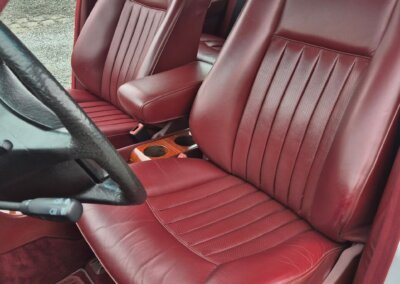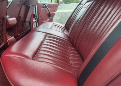 Wnętrze zachowane w perfekcyjnym stanie. Skórzana tapicerka beż żadnych uszkodzeń czy śladów zużycia, robi ogromne wrażenie. Wszelkie materiały wnętrza mają żywy kolor, nie noszą śladów uszkodzeń od słońca czy wilgoci. Drewna prawie jak nowe, bez widocznych pęknięć. Żadne przyciski nie są powycierane. Oryginalne radio Becker Avus w pełni sprawne. Komplet oryginalnych dywaników rypsowych w bardzo dobrym stanie.