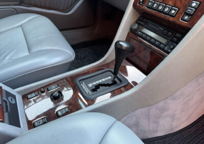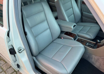 Wnętrze zachowane w bardzo dobrym stanie, widoczne jedynie minimalne ślady użytkowania. Skórzana tapicerka jest wciąż miękka i matowa, bez przetarć czy uszkodzeń. Żadne elementy nie były obszywane. Oryginalne radio. Dwa zestawy dywaników, rypsowe oraz welurowe szare. Elementy drewniane w niesamowitym stanie, jak nowe, mają bardzo żywy kolor i są wolne od pęknięć. Podsufitka odkleja się z wieku po bokach ale nie rzuca się to w oczy. Plastiki matowe bez rys czy pęknięć. Skórzana kierownica i wybierak idealnie utrzymane, nie obszywane ani nie regenerowane. Schowek z drewnianą roletką pod podłokietnikiem. Brak uszkodzeń od słońca.