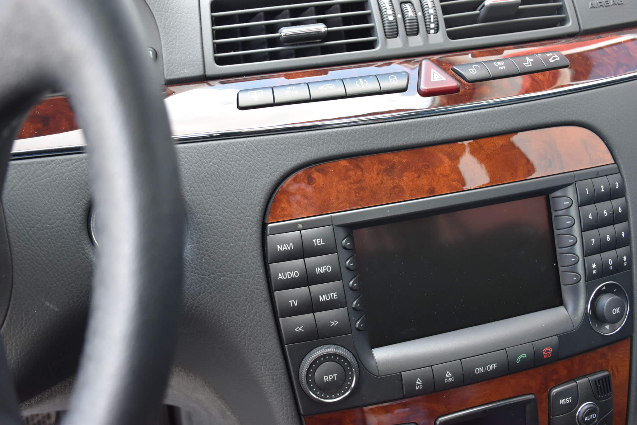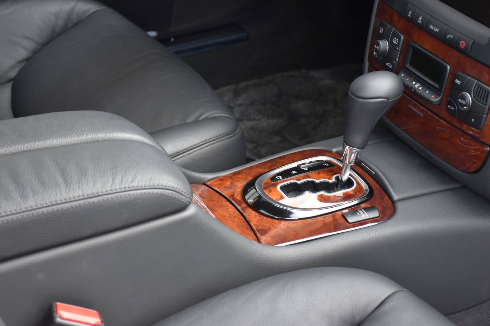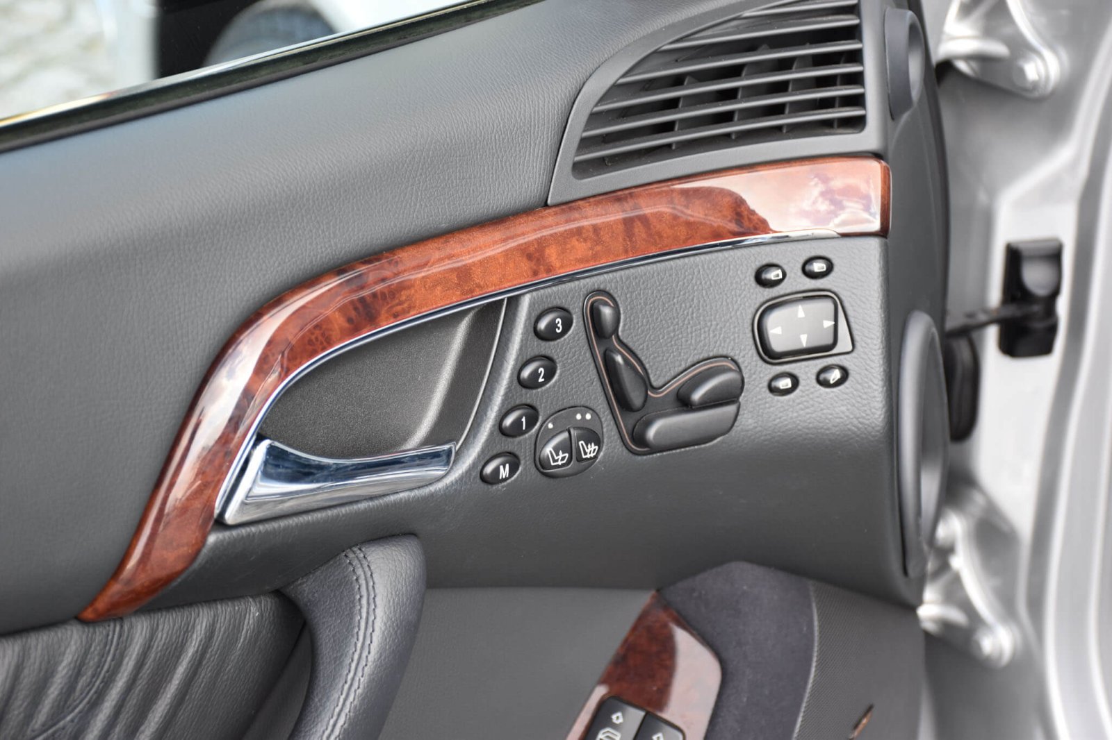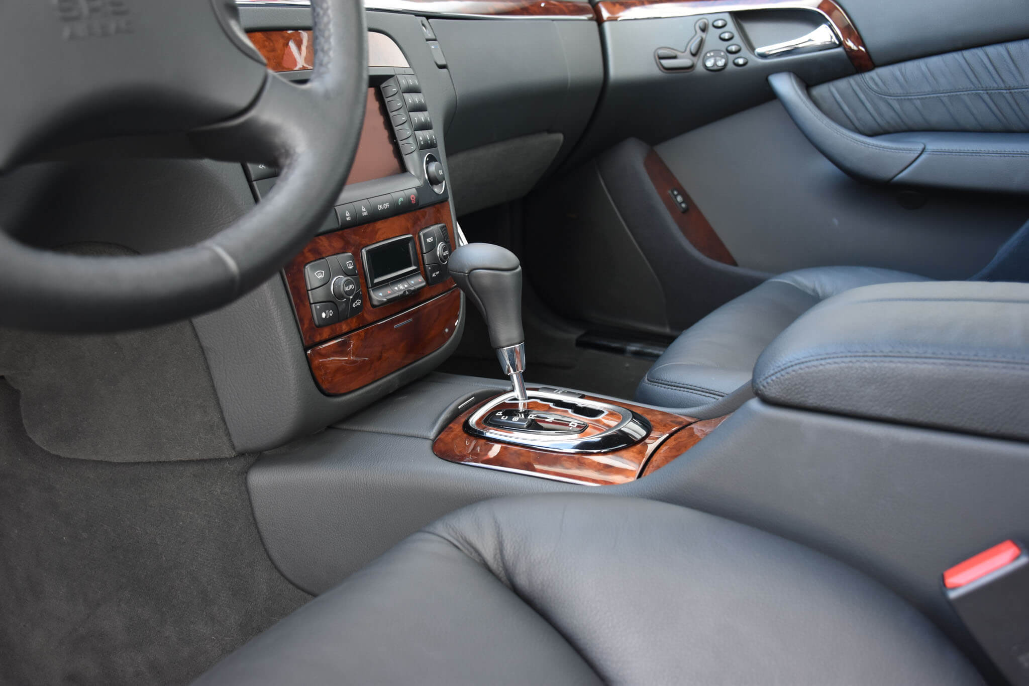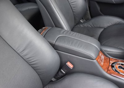 Wnętrze zachowane w perfekcyjnym stanie, widoczne jedynie minimalne ślady użytkowania. Skórzana tapicerka jest jak nowa, bez przetarć czy uszkodzeń. Żadne elementy nie były obszywane czy poddawane regeneracji. Oryginalny command w pełni sprawny. Oryginalne dywaniki z grubego weluru. Elementy drewniane jak nowe bez żadnych rys czy pęknięć. Piksele w wyświetlaczach idealne, wszystkie zegary sprawne. Podsufitka cała. Plastiki matowe bez rys czy pęknięć.