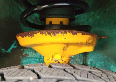 Komplet oryginalnych felg z odpryskami na dekielkach. Opony wiekowe ale z dobrym bieżnikiem, bodajże mają 23 lata lub są od nowości…