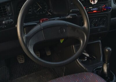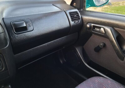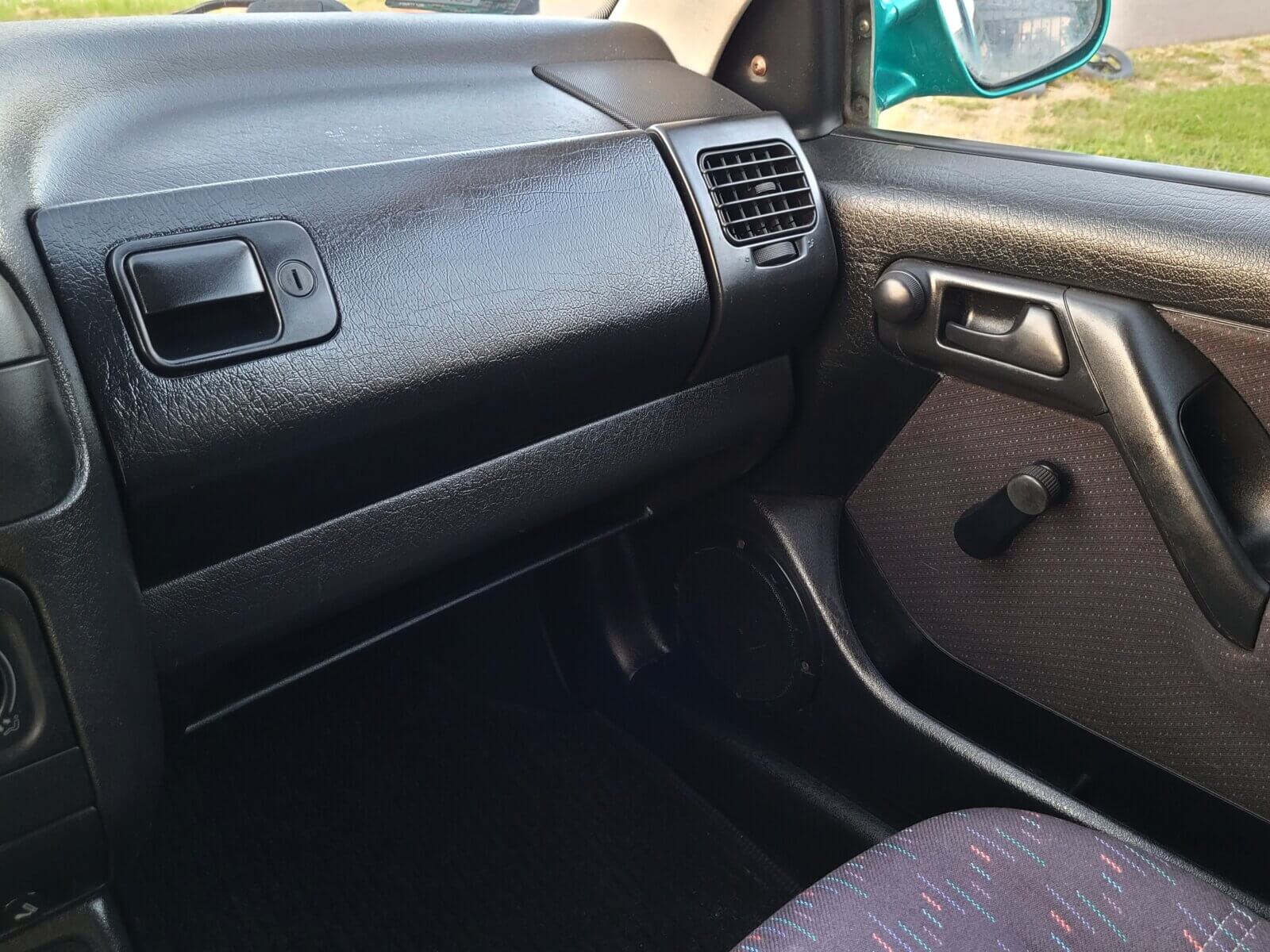 Wnętrze zachowane w idealnym stanie, widoczne jedynie minimalne ślady użytkowania. Tapicerka jest wciąż świeża, jak nowa, bez przetarć czy uszkodzeń. Żadne elementy nie były obszywane. Radio z USB, AUX – nieoryginalne. Plastiki matowe bez rys czy pęknięć. Brak uszkodzeń od słońca czy wilgoci. Podsufitka nie opada.